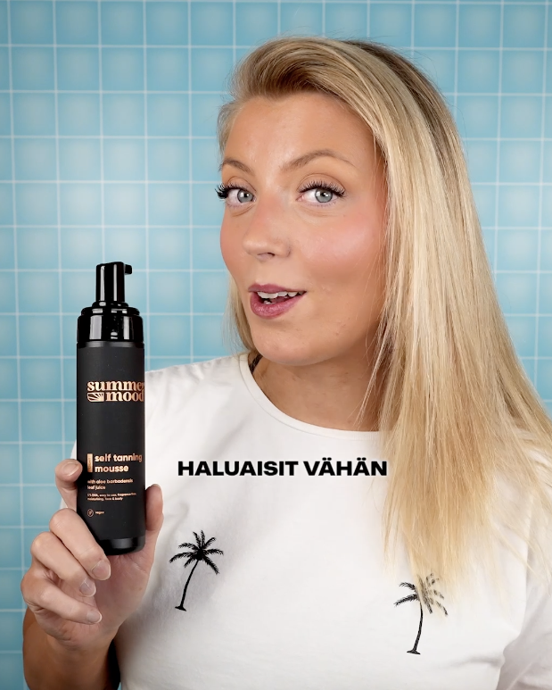 Self Tanning Mousse – Medium 200 ml itseruskettavalla moussella saat intensiivisemmän päivetyksen kuin Lightilla. Tuote on helppo levittää koko vartaloon levityskintaalla. Tuote sisältää aloe veraa, joka kosteuttaa ja hoitaaa ihoasi. Medium sisältää 10 % DHA. Vinkki: Jos haluat todella intensiivisen ja paahteisen päivetyksen, anna tuotteen imeytyä ihoon 20 minuuttia ja levitä toinen kerros.
